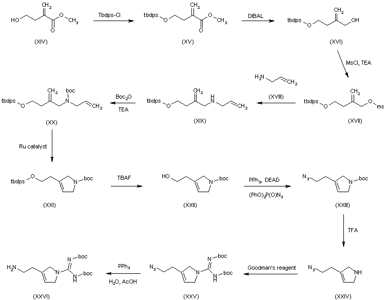 Synthesis of the 3-pyrroline intermediate (XXVI): The reaction of 4-hydroxy-2-methylenebutyric acid methyl ester (XIV) with Tbdps-Cl and imidazole in DMF gives the silyl ether (XV), which is reduced with DIBAL in dichloromethane to yield the butanol derivative (XVI). The reaction of (XVI) with MsCl and TEA affords the corresponding mesylate (XVII), which is condensed with allylamine (XVIII) to provide the secondary amine (XIX). The protection of the NH group of (XIX) by reaction with Boc2O and TEA gives the carbamate (XX), which is submitted to a ring closing metathesis reaction using a Grubbs Ru catalyst to yield the 3-pyrroline derivative (XXI). The cleavage of the silyl ether group of (XXI) by means of TBAF in THF affords the pyrroline ethanol derivative (XXII), which is treated with PPh3, DEAD and (PhO)2P(O)N3 in THF to provide the azido derivative (XXIII). The deprotection of the NH group of (XXIII) by means of TFA in dichloromethane gives the 3-(2-azidoethyl)-3-pyrroline (XXIV), which is treated with Goodman's reagent to yield the protected amidino derivative (XXV). Finally, the azido group of (XXV) is reduced by means of PPh3, water and AcOH to afford the desired 3-pyrroline-1-carboxamidine (XXVI).