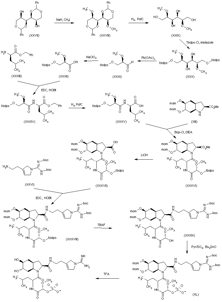 Synthesis of dysinosin A: The reaction of the commercially available D-mannitol derivative (XXVII) with NaH and MeI in DMF gives the dimethoxy compound (XXVIII), which is hydrogenated with H2 over Pd/C in EtOH/EtOAc to yield the dimethoxy-D-mannitol (XXIX). The selective silylation of the primary OH groups of (XXIX) with Tbdps-Cl and imidazole affords the bis silyl ether (XXX), which is submitted to an oxidative cleavage of its vicinal diol group by means of Pb(OAc)4 to provide 2(R)-methoxy-3-(Tbdps-O)propanal (XXXI) (3). The oxidation of (XXXI) with NaClO2 gives the corresponding carboxylic acid (XXXII), which is condensed with D-leucine benzyl ester (XXXIII) by means of EDC and HOBt in dichloromethane to yield adduct (XXXIV). The reductive cleavage of the benzyl group of (XXXIV) with H2 over Pd/C in methanol affords the substituted leucine (XXXV), which is condensed with the perhydroindole intermediate (XIII) by means of Bop-Cl and DIEA in acetonitrile to provide the amide (XXXVI). The hydrolysis of the methyl ester group of (XXXVI) with LiOH in THF/MeOH gives the carboxylic acid (XXXVII), which is condensed with the aminoethyl-3-pyrroline intermediate (XXVI) by means of EDC and HOBt in dichloromethane to yield the amide intermediate (XXXVIII). The cleavage of the silyl ether group of (XXXVIII) by means of TBAF in THF affords the primary alcohol (XXXIX), which is treated with Pyr/SO3 and Bu2SnO to provide the sulfate ester (XL). Finally, this compound is fully deprotected by means of TFA in dichloromethane and purified by means of preparative HPLC to obtain the target dysinosin A (2).