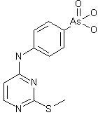 The title compound is prepared by condensation between 4-chloro-2-(methylthio)pyrimidine (I) and p-arsanilic acid (II) in refluxing alcohol.