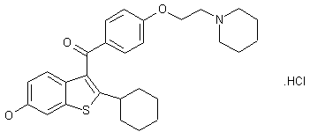 Lithiation of 6-methoxybenzothiophene (I), followed by condensation with cyclohexanone (II) provides the hydroxycyclohexyl benzothiophene (III), which is further dehydrated to the cyclohexenyl analogue (IV) under acidic conditions (1). In a related procedure, the cyclohexenyl benzothiophene (IV) is prepared by condensation of the lithiated derivative of (I) with cyclohexenyl triflate (V) in the presence of ZnCl2 and Pd(PPh3)4 (2). Catalytic hydrogenation of olefin (IV) over Pd/C leads to the cyclohexyl benzothiophene (VI) (1,2). Subsequent Friedel-Crafts acylation of (VI) with 4-(2-chloroethoxy)benzoyl chloride (VII) yields ketone (VIII) (1). Displacement of the chloride group in (VIII) with piperidine furnishes the piperidinyl ethoxy derivative (IX). The methyl ether (IX) is finally cleaved by treatment with AlCl3 and EtSH to produce the target phenol derivative (1,3-5).