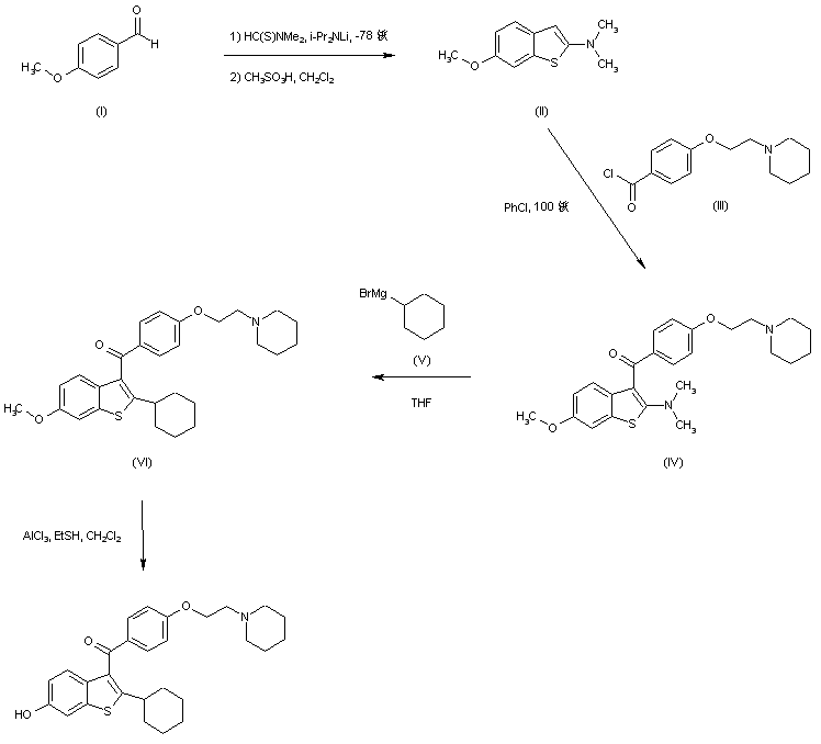In an alternative procedure, condensation of 4-methoxybenzaldehyde (I) with N,N-dimethyl thioformamide in the presence of LDA, followed by treatment with methanesulfonic acid leads to 6-methoxy-2-(dimethylamino)benzothiophene (II), which is subsequently acylated with 4-[2-(-1piperidino)ethoxy]benzoyl chloride (III) in hot chlorobenzene to provide the 3-benzoyl benzothiophene (IV) (6). The dimethylamino group in (IV) is displaced with cyclohexylmagnesium bromide (V) yielding (VI). Finally, methyl ether (VI) cleavage by means of AlCl3 and EtSH gives rise to the title compound (6,7).