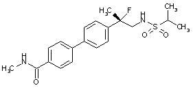 Treatment of 4'-iodoacetophenone (I) with cyanotrimethylsilane in the presence of KCN and crown ether provides the silyl-protected cyanohydrin (II), which is reduced with borane-dimethyl sulfide complex in refluxing THF to afford, after deprotection with methanolic HCl, the amino alcohol (III). Acylation of amine (III) with 2-propanesulfonyl chloride (IV) yields sulfonamide (V). The hydroxyl group in (V) is replaced by fluoride employing DAST in cold CH2Cl2, and the obtained racemic fluoride is then resolved by preparative chiral HPLC to furnish the required (S)-enantiomer (VI). Suzuki coupling between aryl iodide (VI) and 4 carboxybenzeneboronic acid (VII) leads to the biphenylcarboxylic acid (VIII). Finally, activation of acid (VIII) as the corresponding acid chloride by means of oxalyl chloride, followed by treatment with methylamine leads to the title N methyl carboxamide.