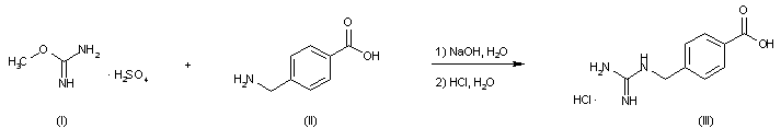 O-Methyl isourea disulfate (I) is condensed with 4-aminomethylbenzoic acid (II) in 2 N NaOH solution to produce the corresponding guanidine, which is isolated as the hydrochloride salt (III). (1,2)