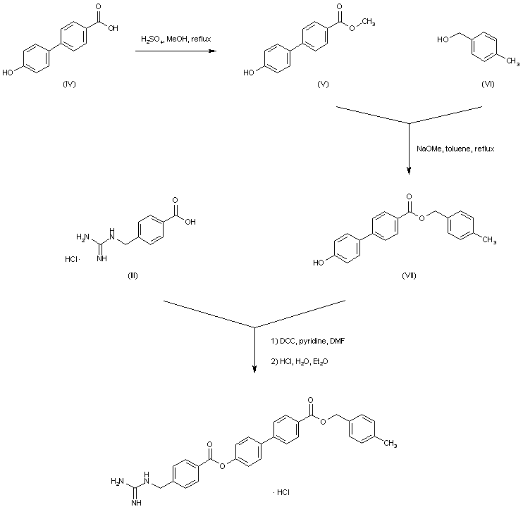 Esterification of 4'-hydroxybiphenyl-4-carboxylic acid (IV) with MeOH in the presence of H2SO4 produces the methyl ester (V), which is further transesterified with 4-methylbenzyl alcohol (VI) under basic conditions to generate the corresponding methylbenzyl ester (VII). Phenol (VII) is finally coupled with 4-(guanidinomethyl)benzoic acid (III) by means of DCC/pyridine to yield the target guanidino diester. (1,2)