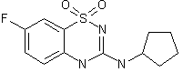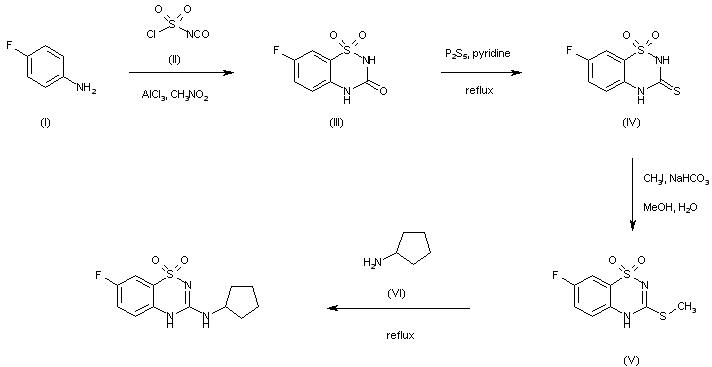 Reaction of 4-fluoroaniline (I) with chlorosulfonyl isocyanate (II) in the presence of aluminum trichloride gives rise to the benzothiadiazine dioxide (III). After conversion of the 3-oxo compound (III) into the corresponding thioxo derivative (IV) by means of phosphorus pentasulfide in pyridine, methylation with iodomethane and NaHCO3 affords the 3-methylsulfanyl benzothiadiazine (V) (1). Finally, the methylsulfanyl group in (V) is displaced by cyclopentylamine (VI) to furnish the target compound (1,2).