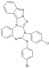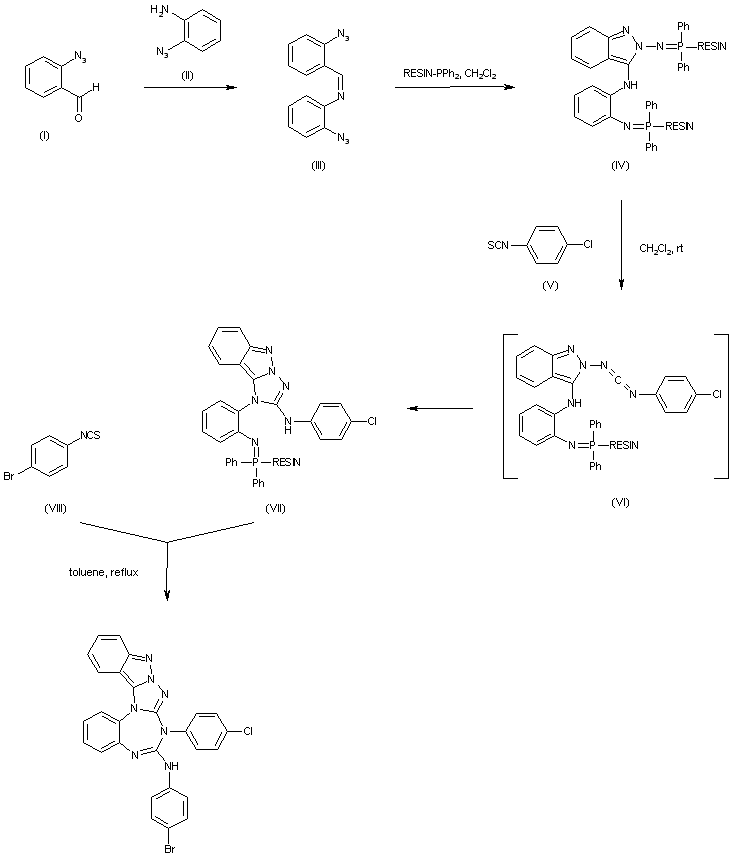 The condensation between 2-azidobenzaldehyde (I) and 2-azidoaniline (II) produces the bis-azido imine (III), which upon coupling to polymer bound triphenylphosphine gives rise to the indazole derivative (IV). Aza-Wittig condensation of (IV) with 4-chlorophenyl isothiocyanate (V) generates the intermediate carbodiimide (VI) which spontaneously cyclizes to the triazoloindazole (VII). Subsequent condensation of (VII) with 4-bromophenyl isothiocyanate (VIII) furnishes the target pentacyclic compound.