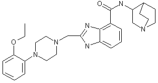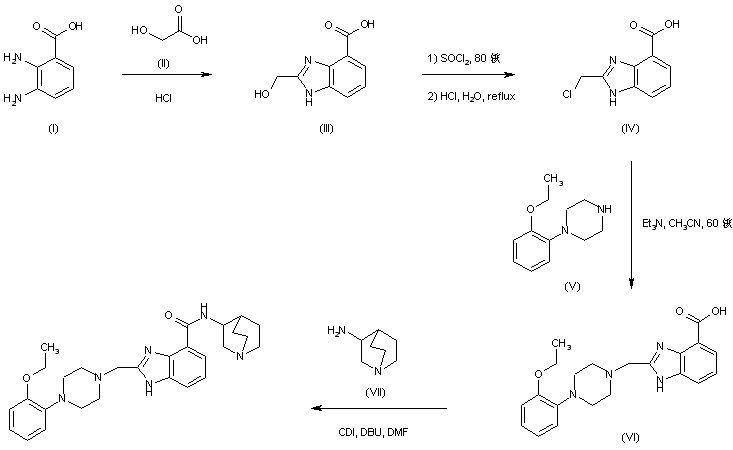 2,3-Diaminobenzoic acid (I) is condensed with glycolic acid (II) under acidic conditions to produce 2-(hydroxymethyl)benzimidazole-4-carboxylic acid (III). Chlorination of (III) with SOCl2, followed by acidic hydrolysis of the acid chloride group leads to the chloromethyl benzimidazole (IV). Condensation of chloride (IV) with 1-(2-ethoxyphenyl)piperazine (V) furnishes the disubstituted piperazine (VI). Acid (VI) is finally coupled to 3-aminoquinuclidine (VII) via activation with CDI to produce the title amide. (1-3)