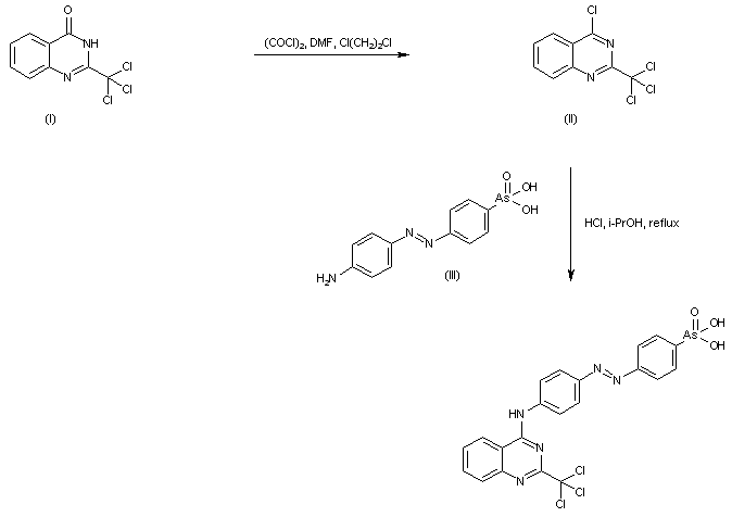 2-(Trichloromethyl)quinazolin-4-one (I) is chlorinated with oxalyl chloride in the presence of DMF producing 4-chloro-2-(trichloromethyl)quinazoline (II). Subsequent coupling of chloroquinazoline (II) with 4-(4'-aminophenylazo)phenylarsonic acid (III) in refluxing isopropanol furnishes the title compound. (1,2)