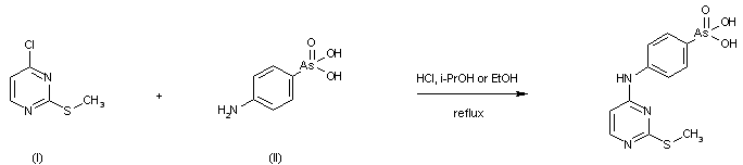 The title compound is prepared by condensation between 4-chloro-2-(methylthio)pyrimidine (I) and p-arsanilic acid (II) in refluxing alcohol.