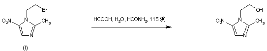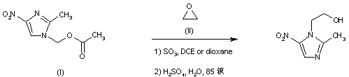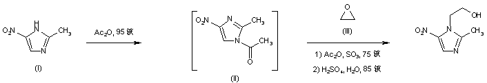 The title compound can be obtained by reaction of 1-(acetoxymethyl)-2-methyl-4-nitroimidazole (I) with ethylene oxide (II) in the presence of sulfur trioxide, followed by hydrolysis in aqueous H2SO4