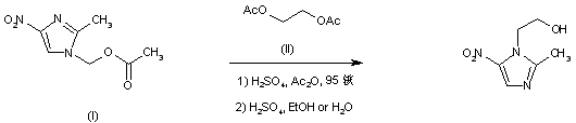 In a related procedure, 1-(acetoxymethyl)-2-methyl-4-nitroimidazole (I) is condensed with ethyleneglycol diacetate (II) in the presence of anhydrous H2SO4, followed by hydrolysis or alcoholysis under acidic conditions to produce the title compound