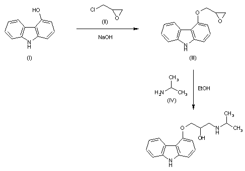 By condensation of 4-hydroxycarbazole (I) with epichlorohydrin (II) by means of NaOH in aqueous dioxane at 40 C to yield 4-(2,3-epoxypropoxy)carbazole (III), followed by treatment with isopropylamine (IV) in refluxing ethanol