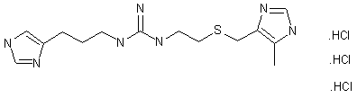 The reaction of N-[2-[(5-methyl-4-imidazolyl)methylthio]ethyl]thiourea (I) with methyl iodide in methanol gives the corresponding thiouronium iodide (II), which is converted into the sulfate by treatment with IRA 401 ion-exchange resin. Finally, this sulfate is condensed with 4-(3-aminopropyl)imizadole (III) in refluxing water.