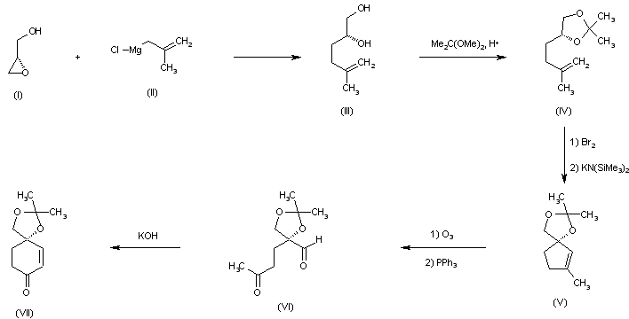 The chiral cyclohexenone intermediate (VII) was prepared as follows. Epoxide ring opening of (S)-glycidol (I) with the Grignard reagent (II) produced diol (III), which was protected as the isopropylidene ketal (IV) by treatment with 2,2-dimethoxypropane. Addition of bromine to olefin (IV) and further cyclization of the resultant dibromide in the presence of potassium hexamethyldisilazide gave rise to the spiro cyclopentene (V). Ozonolysis of (V), followed by reductive work-up, yielded the keto aldehyde (VI), which upon treatment with KOH underwent intramolecular aldol condensation to the target cyclopentenone (VII).