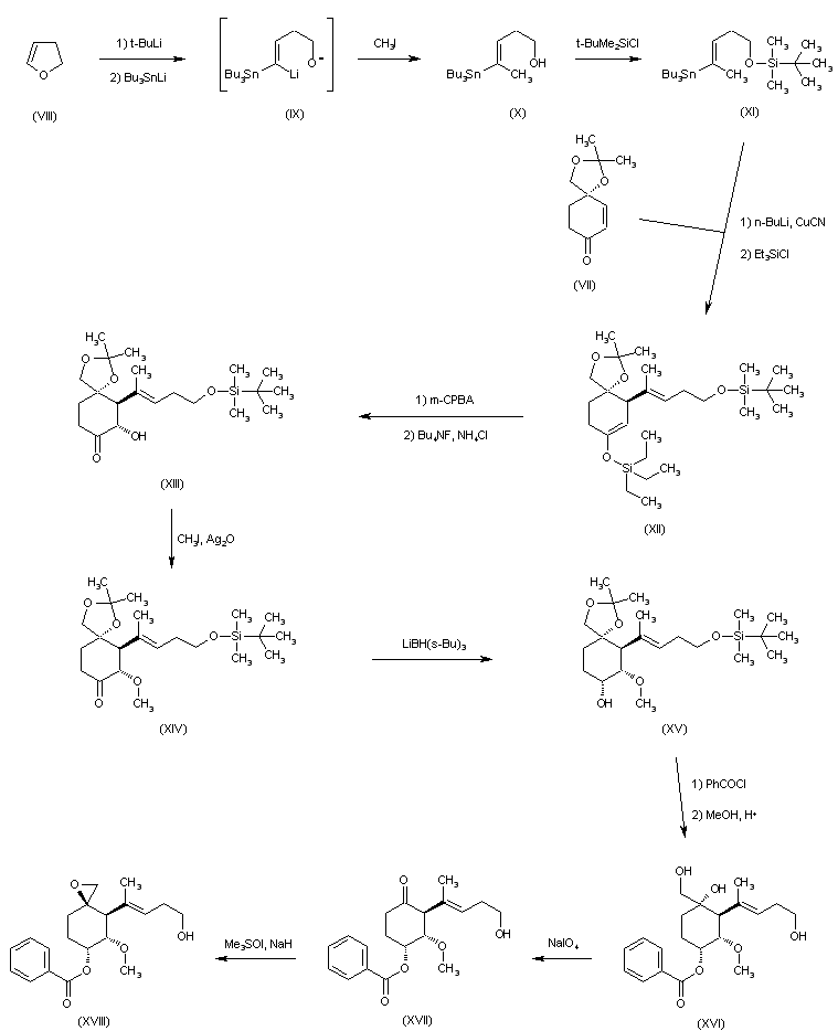 Lithiation of dihydrofuran (VIII), followed by the addition of tributylstannyllithium, gave an intermediate (IX) that was quenched with methyl iodide to produce alcohol (X). Silylation of alcohol (X) with tert-butyl dimethylsilyl chloride then gave silyl ether (XI). Copper-catalyzed conjugate addition of the organolithium reagent derived from (XI) to the intermediate enone (VII), with subsequent enolate trapping with triethylsilyl chloride, afforded adduct (XII) as the major diastereoisomer. Epoxidation of the silyl enol ether (XII) with m-chloroperbenzoic acid, followed by selective desilylation using tetrabutylammonium fluoride/ammonium chloride, gave rise to hydroxy ketone (XIII). Methylation of (XIII) in the presence of silver oxide yielded methyl ether (XIV). Then, the keto group of (XIV) was stereoselectively reduced to (XV) employing L-selectride. After protection of the hydroxyl group of (XV) as the benzoate ester, simultaneous deprotection of the ketal and silyl ether functions under acidic conditions provided triol (XVI). Oxidative cleavage of the 1,2-diol moiety of (XVI) with NaIO4 gave ketone (XVII). This was converted to epoxide (XVIII) by stereoselective addition of in situ generated trimethylsulfoxonium ylide.