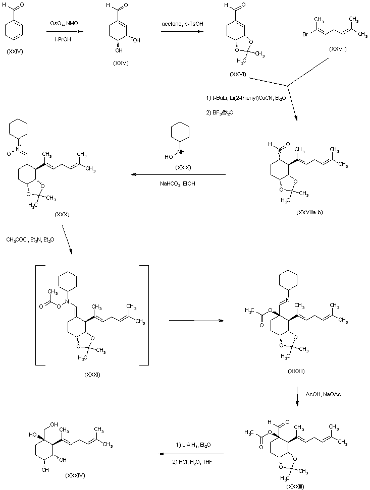 The synthesis of the racemic fumagillol (+/-)-(XXII) has also been reported. Regioselective dihydroxylation of 1,3-cyclohexadiene-1-carbaldehyde (XXIV) using N-methylmorpholine-N-oxide in the presence of a catalytic amount of OsO4 afforded the cis-diol (XXV), which was further protected as the isopropylidene ketal (XXVI). Conjugate addition to (XXVI) of the organocuprate reagent derived from vinyl bromide (XXVII) in the presence of BF3稥t2O produced (XXVIII) as a mixture of epimers at C-1, which were used without separation. Aldehyde (XXVIII) was converted to the cyclohexyl nitrone (XXX) upon treatment with N-cyclohexyl hydroxylamine (XXIX) and NaHCO-3. Acetylation of (XXX) produced a transitory N-vinyl-O-acetylhydroxylamine (XXXI) which underwent a [3,3] sigmatropic rearrangement to the alpha-acetoxy-N-cyclohexylimine (XXXII). Selective hydrolysis of the imine function of (XXXII) using HOAc/NaOAc furnished aldehyde (XXXIII). This was reduced with LiAlH4, followed by acidic hydrolysis of the isopropylidene ketal to yield the tetraol (XXXIV).
