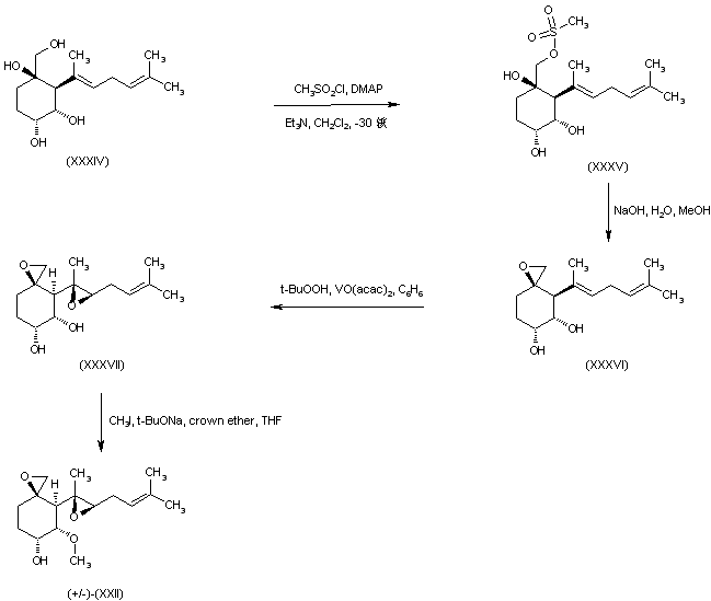 The primary alcohol group of (XXXIV) was selectively converted to mesylate (XXXV), which was subsequently treated with methanolic NaOH to afford the spiro-epoxide (XXXVI). Sharpless epoxidation of diene (XXXVI) in the presence of tert-butyl hydroperoxide and vanadyl acetylacetonate gave rise to the bis-epoxide (XXXVII) as the major diastereoisomer. Finally, regioselective hydroxyl group alkylation in (XXXVII) under Williamson's synthesis conditions furnished the racemic fumagillol (+/-)-(XXII).