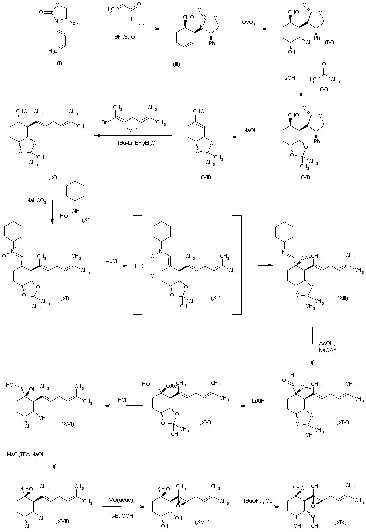The cyclization of the chiral diene (I) with acrolein (II) by means of BF3/Et2O in dichloromethane gives the chiral cyclohexene (III), which is dihydroxylated under Upjohn conditions (OsO4) yielding the dihydroxy compound (IV). The reaction of (IV) with acetone (V) and TsOH affords the isopropylidene derivative (VI), which is treated with NaOH in THF/water to eliminate the chiral auxiliary to yield the cyclohexene carbaldehyde (VII). The regio- and diastereoselective condensation of (VII) with bromide (VIII) by means of t-BuLi and BF3/Et2O affords the adduct (IX), which is treated with N-cyclohexyl-hydroxylamine (X) to provide the nitrone (XI). The reaction of (XI) with acetyl chloride gives the alpha-acetoxy-N-cyclohexylimine (XIII), through the intermediate (XII). The hydrolysis of (XIII) with AcOH and NaOAc yields the carbaldehyde (XIV), which is reduced with LiAlH4 in ethanol to afford the hydroxymethyl derivative (XV). The hydrolysis of the acetoxy and isopropylidene groups of (XV) by means of HCl in THF provides the tetrahydroxy derivative (XVI), which is converted into the epoxide (XVII) by a treatment with MsCl, TEA, DMAP and NaOH in dichloromethane. A new epoxidation of (XVII) by means of VO(acac)2 and t-BuOOH in benzene gives the bis-epoxide compound (XVIII), which is finally monomethylated by means of t-BuONa and MeI in THF to yield the target intermediate fumagillol (XIX).