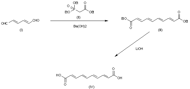 The Horner-Wadsworth-Emmons condensation of (E,E)-muconaldehyde (I) with triethyl phosphonoacetate (II) by means of Ba(OH)2 in THF/water gives (E,E,E,E)-decatetraenedioic acid diethyl ester (III), which is hydrolyzed with LiOH to provide the target intermediate; the (E,E,E,E)-decatetraenedioic acid (IV).
