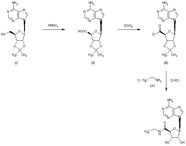 The oxidation of 2',3'-isopropylideneadenosine (I) with potassium permanganate gives 2',3'-isopropylideneadenosine-5'-carboxylic acid (II) which with SOCl2 affords 2',3'-isopropylideneadenosine-5'-carbonyl chloride (III), which is treated first with dry liquid ethylamine and then hydrolyzed with aqueous hydrochloric acid.