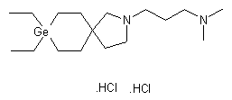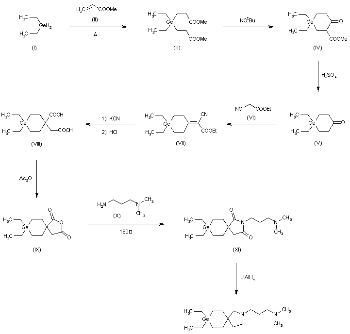 The condensation of diethylgermanium dihydride (I) with methyl acrylate (II) gives diethyldi-(beta-carbomethoxyethyl)germane (III), which is cyclized by treatment with potassium tert-butoxide in refluxing toluene yielding carbomethoxy-4,4-diethyl-4-germacyclohexanone (IV). The decarboxylative hydrolysis of (IV) with refluxing 20% aqueous H2SO4 affords 4,4-diethyl-4-germacyclohexanone (V), which is condensed with ethyl cyanoacetate (VI) by means of ammonium acetate acetic acid in refluxing benzene giving ethyl alpha-cyano-alpha-(4,4-diethyl-4-germacyclohexylidene)acetate (VII). The treatment of (VII) with KCN in ethanol-water, and then with refluxing aqueous HCl yields 4,4-diethyl-4-germacyclohexane-1-carboxy-1-acetic acid (VIII), which is then converted into its cyclic anhydride (IX) by reaction with refluxing acetic anhydride. The reaction of (IX) with 3-dimethylaminopropylamine (X) at 180 C gives N-(3-dimethylaminopropyl)-2-aza-8,8-diethyl-8-germaspiro[4.5]decane-1,3-dione (XI), which is finally reduced with LiAlH4 in benzene-ether.