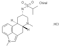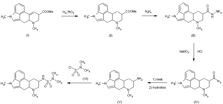 The hydrogenation of 1-methyl-7,8-lysergic acid ethyl ester (I) with H2 over PtO2 gives 1-methyl-9,10-dihydroisolysergic acid methyl ester (II), which by reaction with hydrazine is converted into the corresponding hydrazide (III). The reaction of (III) with NaNO2-HCl yields the expected azide (IV), which is submitted to a Curtius degradation by heating and hydrolysis to afford 1,6-dimethyl-8(alpha)-aminoergoline (V). Finally, this compound is treated with N,N-dimethylsulfamoyl chloride (VI) and 2,6-lutidine in methylene chloride.