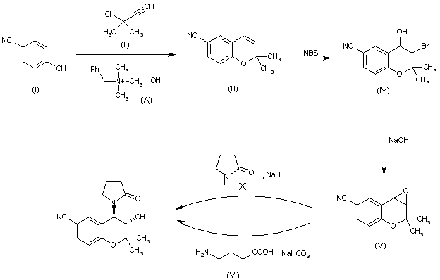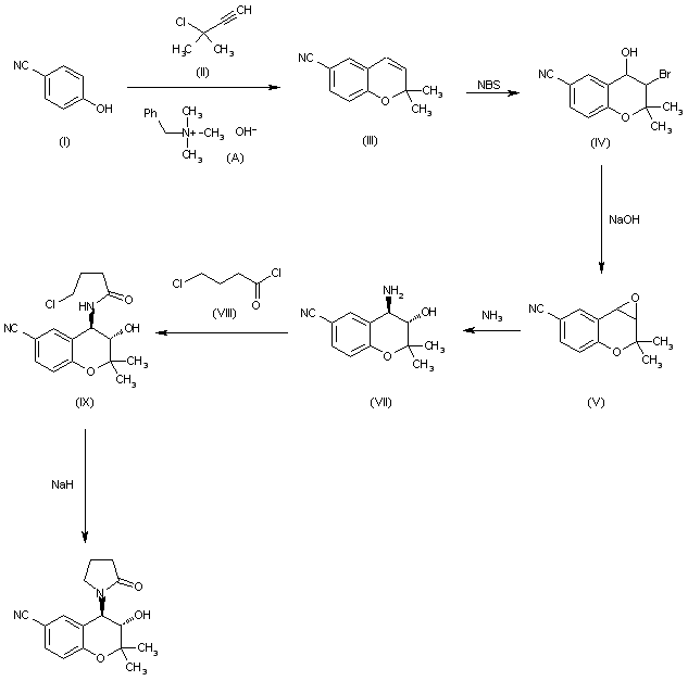 The reaction of epoxide (V) with ammonia in ethanol gives 4-amino-6-cyano-3,4-dihydro-2,2-dimethyl-trans-2H-benzo[b]pyran-3-ol (VII), which is condensed with 4-chlorobutyryl chloride (VIII) by means of NaOH in CHCl3 yielding 6-cyano-3,4-dihydro-2,2-dimethyl-trans-4-(4-chlorobutyrylamino)-2H-benzo[blpyran 3-ol (IX). Finally, this compound is cyclized by means of NaH in THF.