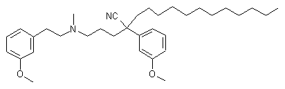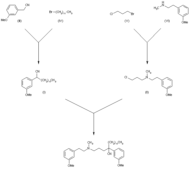 By condensation of 2-(3-methoxyphenyl)tetradecanenitrile (I) [prepared by alkylation of 3-methoxyphenylacetonitrile (III) with 1-bromoundecane (IV) with 1-chloro-4-methyl-6-(3-methoxyphenyl)-4-azahexane (II) (prepared by alkylation of N-methyl-[2-(3-methoxyphenyl)ethylamine (VI) with 1-bromo-3-chloropropane (V)) by means of sodium amide in refluxing toluene.