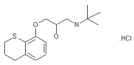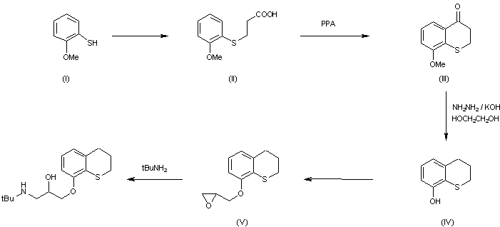 The cyclization of 3-(2-methoxyphenylthio)propionic acid (II) with PPA yields 8 methoxythiochroman-4-one (III). Thiochromanone (III) is then reduced to 8-hydroxythiochromane (IV) by the Wolff-Kishner reduction method. Demethylation is almost complete during this reduction. The 8-hydroxythiochromane (IV), treated with epichlorohydrin, yields the corresponding epoxide (V), which when treated with excess tert-butylamine yields tertatolol base.