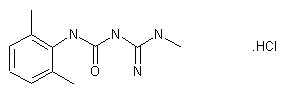 The reaction of 2,6-dimethylaniline (I) with phosgene (II) in refluxing benzene gives 2,6-dimethylphenyl isocyanate (III), which is then condensed with methylguanidine carbonate (A) by means of K2CO3 in THF and treated with HCl to obtain the corresponding hydrochloride.