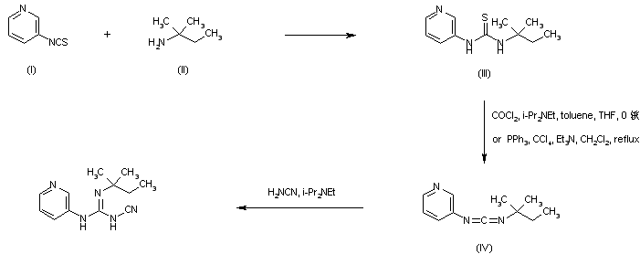 Thiourea (III) was prepared by condensation of 3-pyridyl isothiocyanate (I) with 1,1-dimethylpropyl amine (II). Desulfuration of thiourea (III) by means of phosgene and diisopropyl ethylamine, or triphenylphosphine and CCl4 gave rise to the carbodiimide (IV). Finally, addition of cyanamide to carbodiimide (IV) furnished the target N-cyanoguanidine derivative