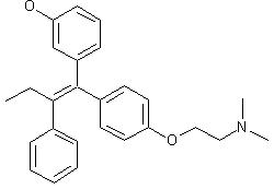 The reaction of 1-(4-methoxyphenyl)-2-phenylethan-1-one (I) with ethyl bromide (A) gave (II) in nearly quantitative yield. Demethoxylation of (II) with pyridine hydrochloride gave (III) in about 70% yield. Treatment of (III) with dimethylaminoethyl chloride (B) gave (IV) in more than 60% yield. Reaction of (IV) with 3'-(2-tetrahydropyranyloxy)phenylmagnesium bromide (C) gave (V) in about 60% yield. Refluxing a solution of (V) in ethanolic hydrochloric acid gave the stereoisomeric E- and Z-mixture (VIa, VIb) of the hydrochloric salt. Fractional crystallization of the mixture in methanol/ether yielded the pure hydrochloric salt of the E-isomer in 48% yield. Conversion of the hydrochloric salt into the free base and treatment of the latter with citric acid yielded the appropriate K-21060E citrate.