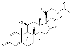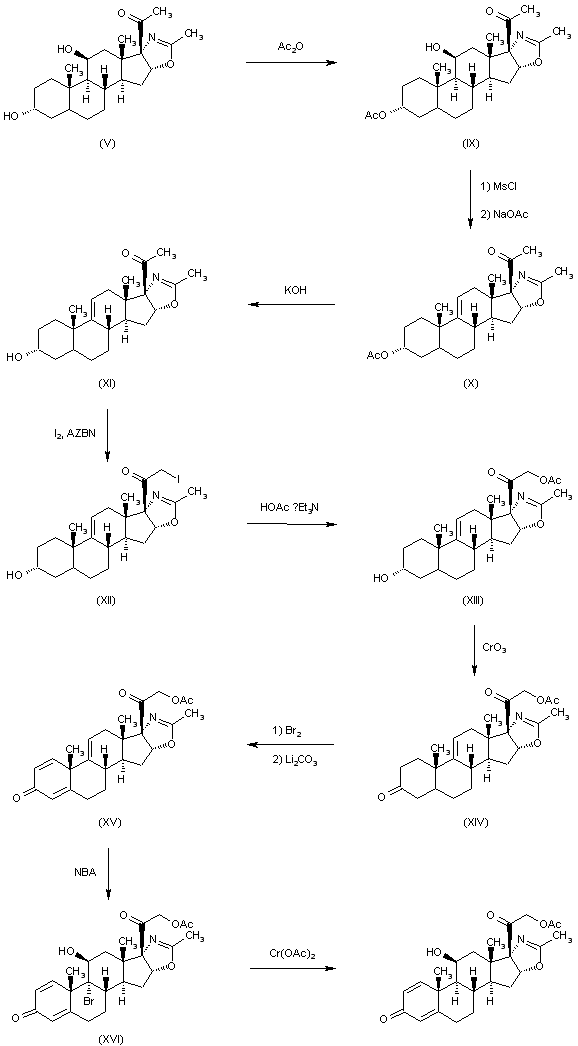 The monoacetylation of (V) with acetic anhydride and pyridine at 100 C gives the 3-acetoxy-11-hydroxy compound (IX), which is dehydrated by treatment with methanesulfonyl chloride and then with sodium acetate yielding 3beta-acetoxy-5alpha-pregn-9(11)-ene-20-one-[17alpha,16alpha-d]-2'-methyloxazoline (X). The hydrolysis of (X) with KOH in refluxing methanol affords the corresponding hydroxy compound (XI), which is acetoxylated by treatment with I2 and AZBN as before giving the iodo derivative (XII), and then with triethylammonium acetate also as before, yielding 3beta-hydroxy-21-acetoxy-5alpha-pregn-9(11)-ene-20-one-[17alpha,16alpha-d]-2'-methyloxazoline (XIII). The oxidation of (XIII) with CrO3 in acetone yields the 3,20-diketone (XIV), which by treatment with Br2 and Li2CO3 as before is dehydrogenated affording the 1,4,9(11)-pregnatriene (XV). Finally, the reaction of (XV) with N-bromoacetamide in THF yields 9alpha-bromo-11beta-hydroxy-21-acetoxy-5alpha-pregna-1,4-dieno-3,20-dione-[17alpha,16alpha-d]-2'-methyloxazoline (XVI), which is then debrominated by reaction with chromous acetate and butanethiol in DMSO.