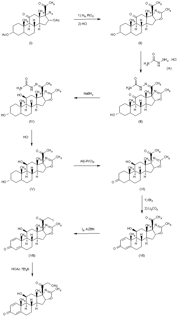 The cyclization of 17alpha-azido-3beta,16alpha-acetoxy-5alpha-pregnane-11,20-dione (I) by hydrogenation with H2 over Pt in methanol, followed by a treatment with 10% HCl gives 3beta-hydroxy-5alpha-pregnane-11,20-dione-[17alpha,16alpha-d]-2'-methyloxazoline (II), which is converted into the semicarbazone (III) by treatment with semicarbazide hydrochloride (A) and pyridine in refluxing methanol. The reduction of one ketonic group of (III) with NaBH4 in refluxing ethanol yields the dihydroxy-semicarbazone (IV), which is hydrolyzed with 10% HCl in refluxing methanol to afford the ketodiol (V). The oxidation of (V) with cyclohexanone and aluminum isopropoxide in refluxing toluene gives 11beta-hydroxy-5alpha-pregnane-3,20-dione-[17alpha,16alpha-d]-2'-methyloxazoline (VI). The dehydrogenation of (VI) by treatment with Br2 in dioxane-acetic acid, followed by treatment with Li2CO3 in DMF at 140 C yields the corresponding 1,4-diene derivative (VII). Finally, the reaction of (VII) with I2 by means of azobisisobutyronitrile in CH2Cl2 affords the corresponding 21-iodo compound, which is then acetylated with triethylammonium acetate in refluxing acetone.