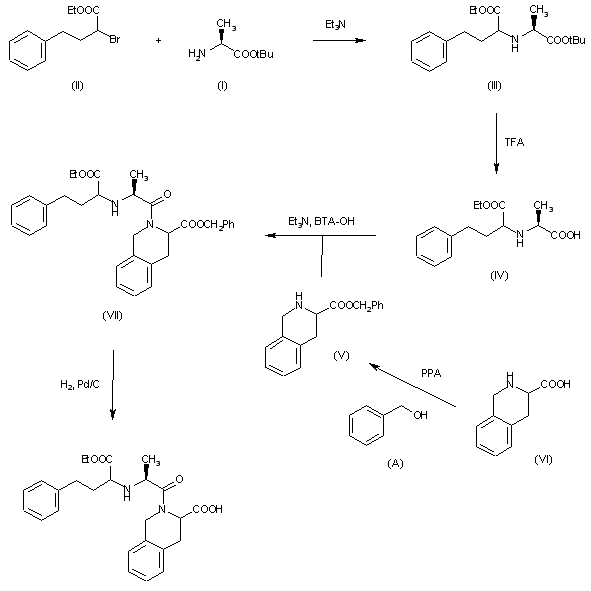 The condensation of alanine tert-butyl ester (I) with ethyl 2-bromo-4-phenylbutanoate (II) by means of triethylamine in hot DMF gives ethyl 2-[[1-(tert-butoxycarbonyl)ethyl]amino]-4-phenylbutanoate (III), which is partially hydrolyzed with trifluoroacetic acid yielding ethyl 2-[[1-carboxyethyl]amino]-4-phenylbutanoate (IV). The condensation of (IV) with benzyl 1,2,3,4-tetrahydroisoquinoline-3-carboxylate (V) [prepared from the corresponding acid (VI) and benzyl alcohol (A) by means of polyphosphoric acid] by means of triethylamine and 1-hydroxybenzotriazole affords benzyl 2-[2-[[1-(ethoxycarbonyl)-3-phenylpropyl]amino]-1-oxopropyl]-1,2,3,4-tetrahydroisoquinoline-3-carboxylate (VII), which is finally debenzylated by hydrogenolysis with H2 over Pd/C in THF.