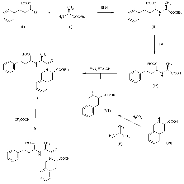 The condensation of alanine tert-butyl ester (I) with ethyl 2-bromo-4-phenylbutanoate (II) by means of triethylamine in hot DMF gives ethyl 2-[[1-(tert-butoxycarbonyl)ethyl]amino]-4-phenylbutanoate (III), which is partially hydrolyzed with trifluoroacetic acid yielding ethyl 2-[[1-carboxyethyl]amino]-4-phenylbutanoate (IV). The condensation of (IV) with tert-butyl-1,2,3,4-tetrahydroisoquinoline-3-carboxylate (VIII) [prepared from the corresponding acid (VI) and isobutylene (B) by means of H2SO4] as before gives tert-butyl-2-[2-[[1-(ethoxycarbonyl)-3-phenylpropyl]amino]-1-oxopropyl]-1,2,3,4-tetrahydroisoquinoline-3-carboxylate (IX), which is finally hydrolyzed partially by treatment with trifluoroacetic acid.
