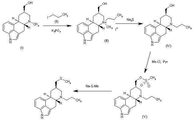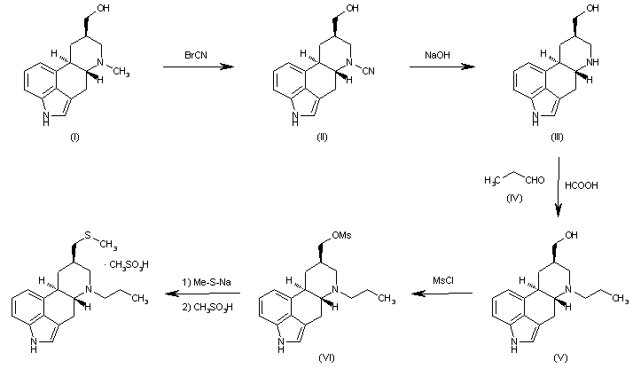 The reaction of dihydrolysergol (I) with BrCN in DMF gives the N-cyano derivative (II), which is treated with NaOH in ethylene glycol yielding the demethylated compound (III). The reductive alkylation of (III) with propionaldehyde (IV) and formic acid in DMF affords the propyl derivative (V), which is mesylated with MsCl and pyridine giving the mesylate (VI). Finally, this compound is treated with sodium methylthiolate and MsOH.