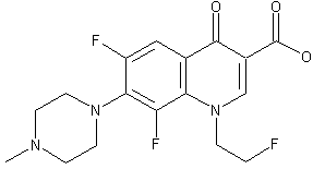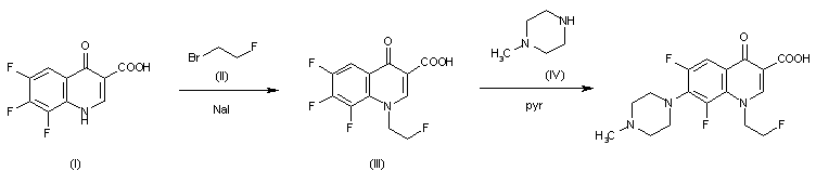 The reaction of 6,7,8-trifluoro-1,4-dihydro-4-oxoquinoline-3-carboxylic acid (I) with 1-bromo-2-fluoroethane (II) by means of NaI in hot DMF gives 6,7,8-trifluoro-1-(2-fluoroethyl)-1,4-dihydro-4-oxoquinoline-3-carboxylic acid (III), which is then condensed with N-methylpiperazine (IV) in refluxing pyridine.