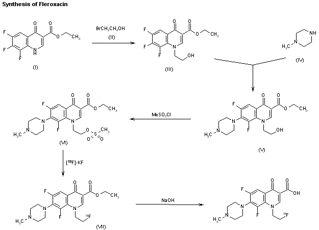 A new synthesis of fleroxacin, labeled with fluorine-18, has been described: The reaction of 6,7,8-trifluoro-4-oxo-1,4-dihydroquinoline-3-carboxylic acid ethyl ester (I) with 2-bromoethanol (II) gives 6,7,8-trifluoro-1-(2-hydroxyethyl)-4-oxo-1,4-dihydroquinoline-3-carboxylic acid ethyl ester (III), which is condensed with N-methylpiperazine (IV), yielding 6,8-difluoro-1-(2-hydroxyethyl)-7-(4-methylpiperazin-1-yl)-4-oxo-1,4-dihydroquinoline-3-carboxylic acid ethyl ester (V). The reaction of (V) with methanesulfonyl chloride affords the corresponding mesylate (VI), which is treated with [18F]-KF in dichloromethane at 80 C to give 6,8-difluoro-1-(2-fluoroethyl)-7-(4-methylpiperazin-1-yl)-4-oxo-1,4-dihydroquinoline-3-carboxylic acid ethyl ester (VII). Finally, this compound is hydrolyzed with NaOH.