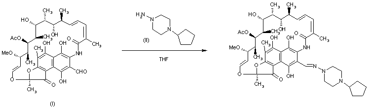 By condensation of 3-formyirifamycin SV (I) with 1-amino-4-cyclopentylpiperazine (II) in THF.