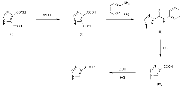 The hydrolysis of diethyl imidazole-4,5-dicarboxylate (I) with aqueous NaOH gives imidazole-4,5-dicarboxylic acid (II), which is partially decarboxylated by treatment with refluxing aniline yielding 4-anilinocarbonylimidazole (III). The hydrolysis of (III) with refluxing aqueous HCl affords imidazole-4-carboxylic acid (IV), which is finally esterified with ethanol and dry HCl at reflux temperature.