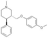 The reaction of methyl N-methyl-1,2,5,6-tetrahydropyridine-3-carboxylate (I) with phenylmagnesium bromide (A) gives methyl 1-methyl-4-phenylpiperidine-3-carboxylate (II), which is reduced with LiAlH4 yielding 1-methyl-3-hydroxymethyl-4-phenylpiperidine (III), which, in turn is resolved into its optical isomers. The alcohol (III) is esterified with methanesulfonyl chloride in pyridine affording 3-(methansulfonyloxymethyl)-1-methyl-4-phenylpiperidine (IV), which is finally condensed with p-methoxyphenol (B) by means of sodium methoxide in refluxing methanol.