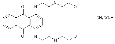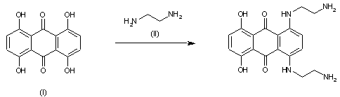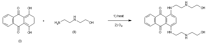 By condensation of 2,3-dihydro-1,4-dihydroxyanthraquinone (I) with N-(aminoethyl)ethanolamine (II) in refluxing ethanol, followed by oxidation with air and treatment with acetic acid.