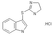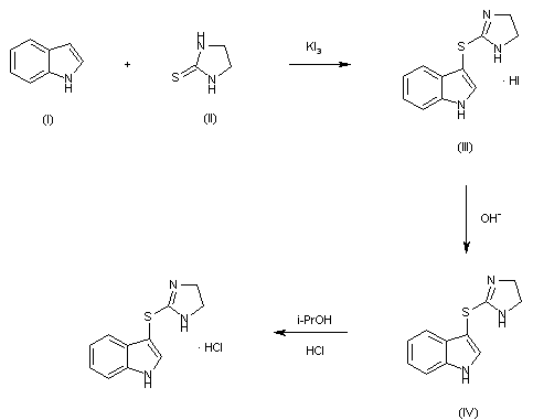 Oxidative coupling of indole (I) and ethylenethiourea (II) with iodine and potassium iodide affords the hydroiodide salt (III) in 89% yield. The hydroiodide salt is converted into the hydrochloride salt on an ion exchange column or through the base.