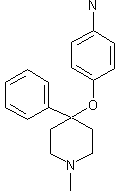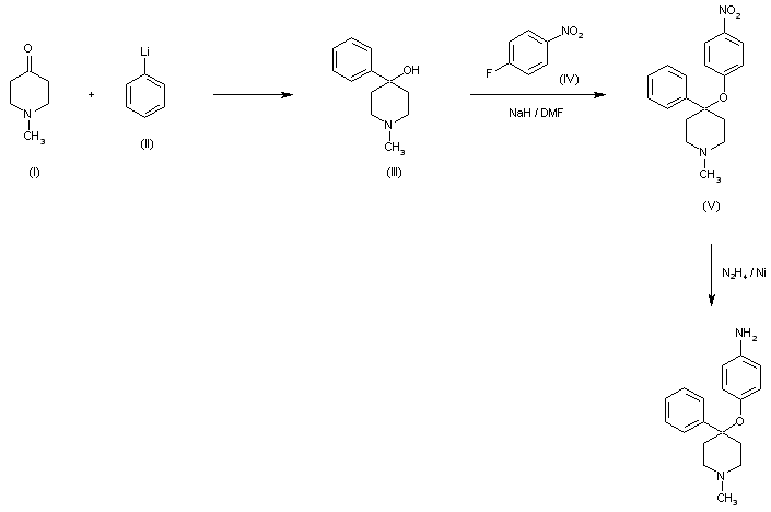 Reaction of 1-methyl-4-piperidone (I) with phenyllithium (II) gives 1-methyl-4-phenyl-4-piperidinol (III), which is alkylated with (IV) in NaH/DMF to yield (V), followed by reduction with hydrazine/Raney-Ni.