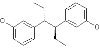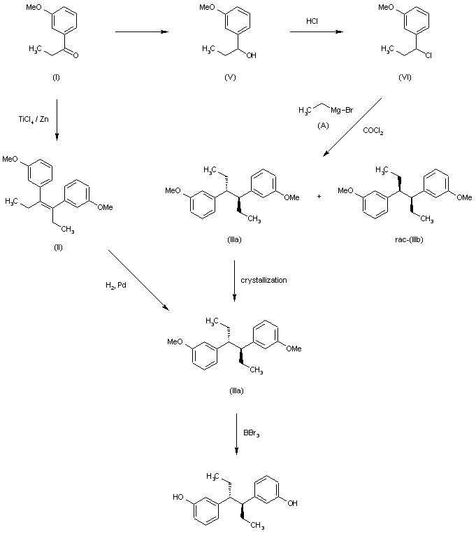 The synthesis of 3,4-bis(3'-methoxyphenyl)hexane (III) was accomplished in two different ways: 1) Reductive coupling of the 3-methoxypropiophenone (I) using the TiCl4/Zn reaction -- introduced by Mukaiyama et al. -- yields preferably the cis-stilbene (II). Catalytic hydrogenation of this alkene using palladium on activated carbon results in the isomerically pure meso-3,4-bis(3'-methoxyphenyl)hexane (III). 2) The reductive coupling of the 1-(3'-methoxyphenyl)-1-chloropropane (VI), obtained from 1-(3-methoxyphenyl)propanol (V) with dry HCl, according to Wilds and McCormack using COCl2 and ethylmagnesium bromide (A) yields mixture of the meso- and di-3,4-bis(3'-methoxyphenyl)hexanes (III). The meso-diastereomer (III) is separated by fractional crystallization from methanol. The ether cleavage of (III) to give 3,4-bis(3'-hydroxyphenyl)hexane is accomplished with BBr3.