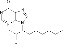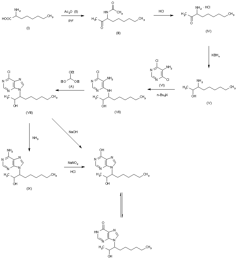 This compound can be obtained by two related ways: 1) The condensation of 2-aminooctanoic acid (I) with acetic anhydride in pyridine at 100 C gives 3-acetamidononan-2-one (III), which is hydrolyzed with refluxing aqueous concentrated HCl yielding 3-aminononan-2-one hydrochloride (IV). The reduction of (IV) with NaBH4 in methanol affords 3-amino-2-nonanol (V), which is condensed with 4,6-dichloro-5-aminopyrimidine (VI) by means of tributylamine in refluxing pentanol giving 5-amino-6-(2-hydroxy-3-nonylamino)-4-chloropyrimidine (VII). The cyclization of (VII) with ethyl orthoformate (A) by means of ethanesulfonic acid in refluxing CHCl3 affords 9-(2-hydroxy-3-nonyl)-6-chloropurine (VIII), which is finally hydrolyzed with refluxing aqueous 0.5 N NaOH. 2) The chloropurine (VIII) is treated with methanolic NH3 at 80-100 C in a pressure vessel to give 9-(2-hydroxy-3-nonyl)adenine (IX), which is then treated with NaNO2 in acetic acid aqueous HCl.