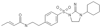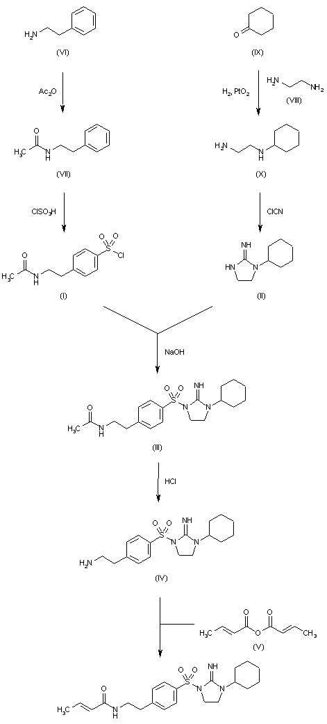 The condensation of 4-[2-(acetylamino)ethyl]benzenesulfonyl chloride (I) with 1-cyclohexyl-2-iminoimidazolidine (III) by means of NaOH in refluxing acetone gives 1-[[4-(2-acetamidoethyl)phenyl]sulfonyl]-3-cyclohexyl-2-iminoimidazolidine (III), which is hydrolyzed with refluxing 2N HCl yielding 1-[[4-(2-aminoethyl)phenyl]sulfonyl]-3-cyclohexyl-2-iminoimidazolidine (IV). Finally, this compound is acylated with crotonic anhydride (V) in dioxane. The starting products (I) and (II) are obtained as follows: 1) The acetylation of 2-phenylethylamine (VI) with acetic anhydride gives N-(2-phenylethyl)acetamide (VII), which is sulfonated with chlorosulfonic acid yielding compound (I). 2) The reductocondensation of cyclohexanone (IX) with ethylenediamine (VIII) gives N-cyclohexylethylenediamine (X), which is then cyclized with cyanogen chloride to compound (II).