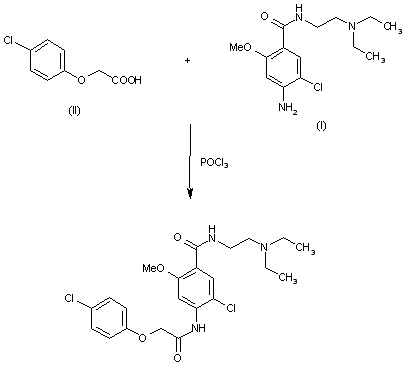By acylation of metoclopramide (I) with 2-(4-chlorophenoxy)acetic acid (II) by means of POCl3 in refluxing chloroform.