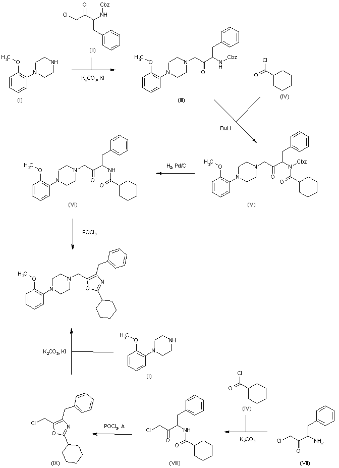 Coupling of piperazine (I) with chloro derivative (II) by means of K2CO3 and KI in acetone affords protected compound (III), which is then condensed with acid chloride (IV) by means of n-BuLi in THF to yield amide (V). Deprotection of (V) by hydrogenation over Pd/C in EtOH provides (VI), which is finally cyclized by treatment with POCl3 in DMF. Alternatively, the synthesis of the target product can be achieved by an analogous route: Acylation of amine (VII) with acid chloride (IV) by means of K2CO3 in CH2Cl2 provides amide (VIII), which is then cyclized by heating with POCl3 in DMF/benzene to give oxazole (IX). Finally, (IX) is condensed with piperazine (I) by means of K2CO3 and KI in acetone.